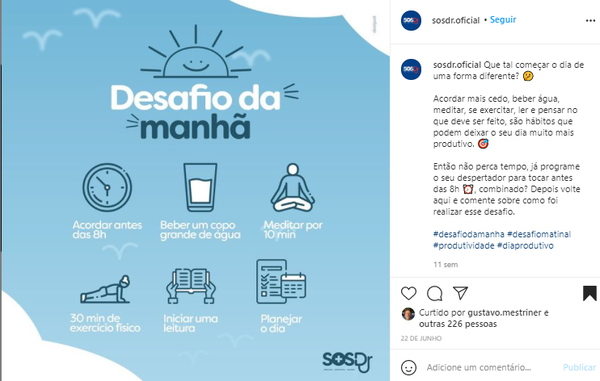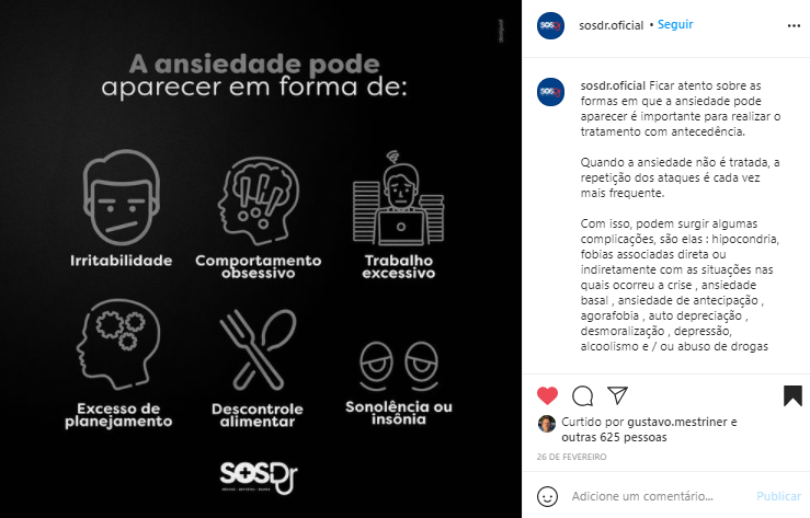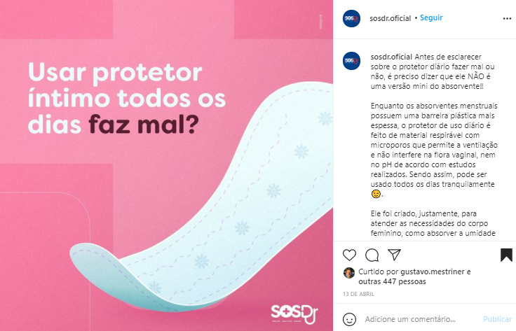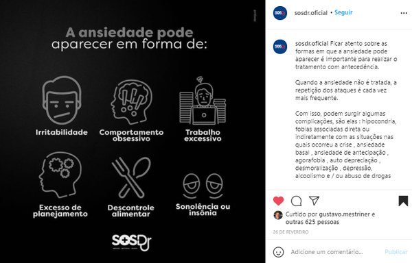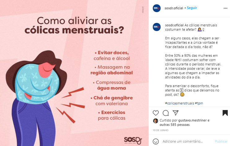 Dentre as minhas experiências durante o curso, tive o prazer de fazer parte do time de comunicação da SOS Doutor, como estagiária. A SOS Dr. é uma clínica médica e odontológica especializada em prevenção. Confira o trabalho de Social Media que desenvolvi na empresa. A principal estratégia utilizada foi mesclar o marketing de conteúdo com técnicas de Copywriting. O resultado foi muito positivo!